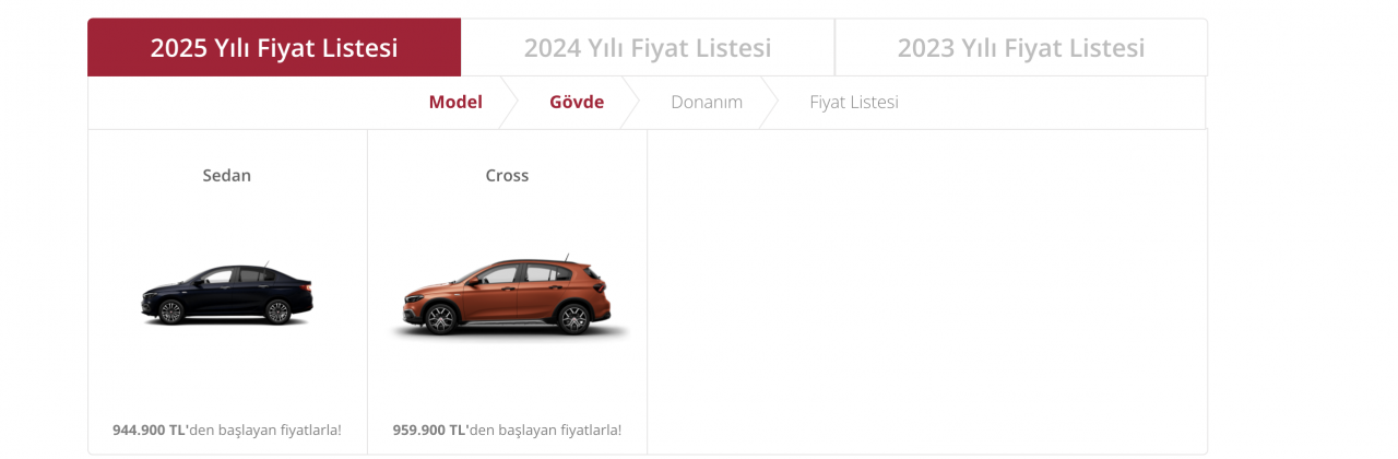 Fiat marka otomobiller Türkiye'de en çok tercih edilen otomobiller arasında yer alıyor. Bu nedenle araba satın almak isteyen birçok kişi 2025 yılı fiyatlarının açıklanmasını bekliyordu. Fiat internet sitesi üzerinden 2025 yılı yeni fiyatlarını resmen duyurdu. Yayınlanan fiyat listesine göre, Fiat Sedan Easy 944 Bin 900 TL'den satışa çıktı.
