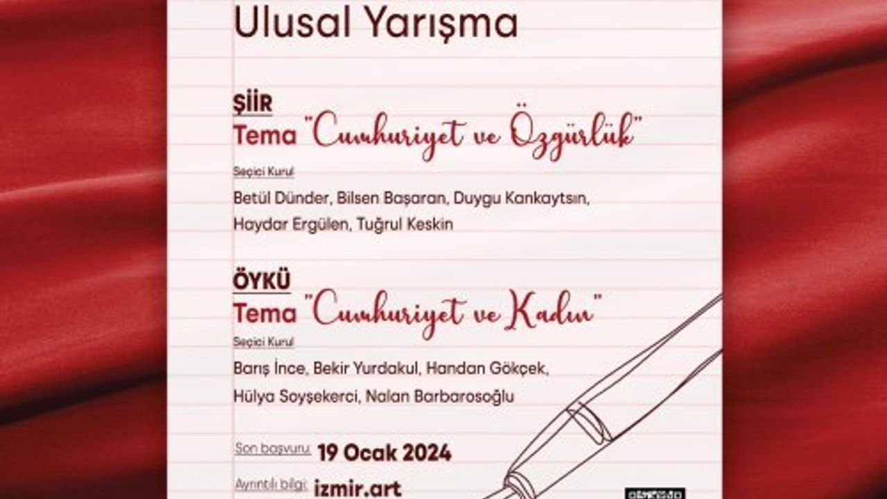 İzmir Büyükşehir Belediyesi’nin Cumhuriyet’in 100’üncü yıl dönümü kapsamında düzenlediği “100. Yılın Öyküsü, Şiiri” adlı ulusal öykü ve şiir yarışmasına başvurular devam ediyor. Son katılım tarihi 19 Ocak 2024 olan yarışma şiir kategorisinde “Cumhuriyet ve Özgürlük”, öykü kategorisinde ise “Cumhuriyet ve Kadın” temalarıyla düzenleniyor. Cumhuriyet’in kurucu kuşağının çağdaş ve aydınlık mirasını ana odağına alan ulusal katılımlı yarışma, yüz yıllık tarihi birikimin toplumsal ve kültürel izdüşümüne mercek tutmayı hedefliyor.