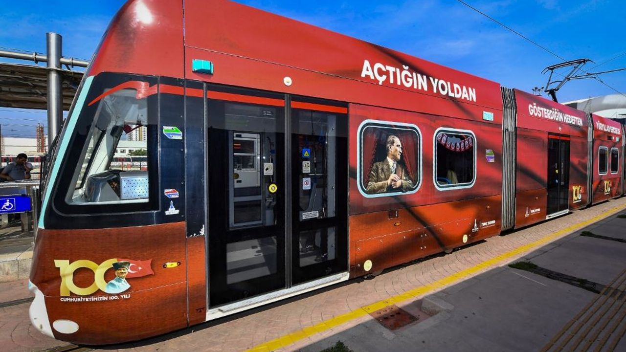 Cumhuriyet’in 100’üncü yıl kutlamaları öncesinde kenti binlerce bayrakla kırmızı beyaz renklere büründüren İzmir Büyükşehir Belediyesi, Fahrettin Altay ile Halkapınar arasında çalışan iki tramvay aracını da 100’üncü yıla yakışır bir şekilde süsledi. İzmirliler, ulu önder Mustafa Kemal Atatürk’ün fotoğrafının da bulunduğu tramvay araçlarına büyük ilgi gösterdi.