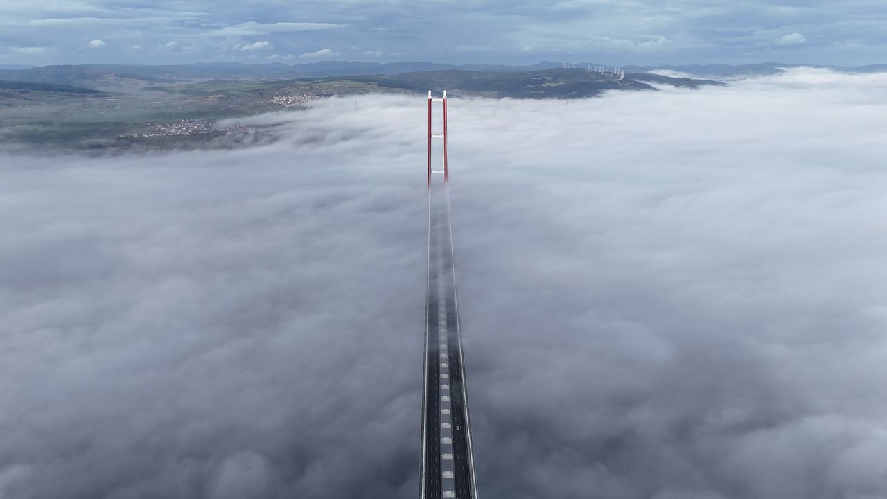 2023 metre orta açıklığıyla dünyanın en uzun orta açıklığa sahip asma köprüsü olan 1915 Çanakkale Köprüsü, sis bulutu altındaki eşsiz görüntüsüyle dikkat çekti.