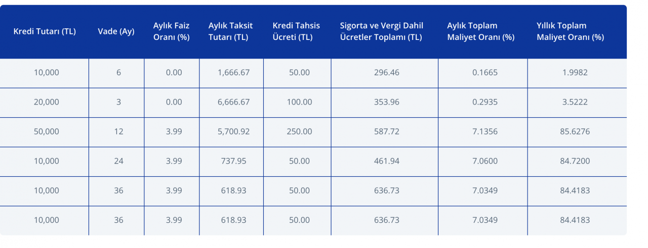- Yasal vade sınırlamaları gereği maksimum vadeler; 100 bin TL üzerindeki tutarlar için 12 ay, 50 bin TL – 100 bin TL aralığındaki tutarlar için 24 ay, 50 bin TL ve altındaki tutarlar için 36 aydır.