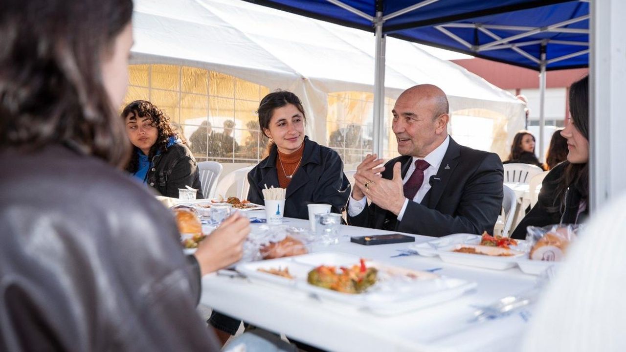 Ziyarette konuşan Başkan Soyer, “Bir kere gençlerin içinde nefes alıyorum. En çok mutlu olduğum yer onların yanı. Gerçekten onlarla beraber olmaktan muazzam bir keyif alıyorum. Katip Çelebi Üniversitesi’nin içindeyiz. Burada günde yaklaşık 750 öğrencimize sıcak yemek servisi yapıyoruz. İzmir’in üniversitelerinde bu uygulamayı başlatmıştık. Katip Çelebi’de de bu işi sürdürüyoruz. Geçen sene kapının dışında yemek veriliyordu. Bu sene rektörlük izin verdi ve içeride hizmet veriyoruz. Çok iyi oldu. Çadırlarla çocukları biraz daha soğuktan koruyan bir şekilde hizmet veriyoruz. Sordum, soruşturdum, çok memnunlar” diye konuştu.