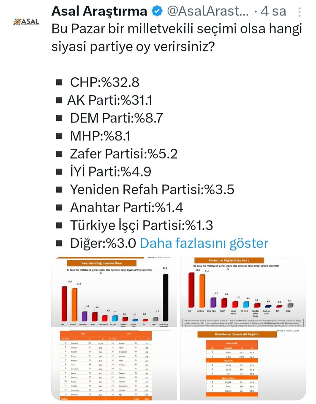 İktidara yakınlığı ile bilinen Asal Araştırma'nın "Bu Pazar bir milletvekili seçimi olsa hangi siyasi partiye oy verirsiniz?" başlıklı anketinin sonuçları oldukça dikkat çekti. Kararsızların oyları göz önüne alındıktan sonra birinci parti yine aynı pozisyonunu korudu.