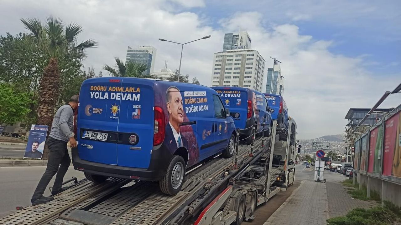 Sakarya’dan İzmir’e gelen tırda Ak Parti logolu sıfır araçlar göze çarptı. AK Parti İzmir İl Başkanlığı’nın önüne gelen Fiat Doblo markalı sıfır seçim arabalarının, İzmir’in çeşitli seçim bölgelerine dağıtılacağı ifade edildi.