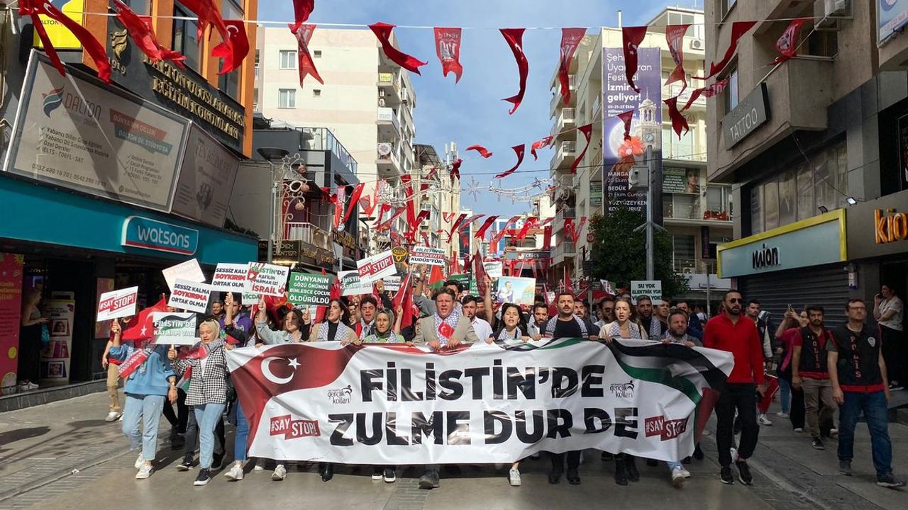 Turgay Kılıç/YENİ İZMİR-AK Parti İzmir Gençlik Kolları, İsrail’in Filistin/Gazze’ye yönelik devam ettirdiği ve dozunu arttırdığı saldırılara karşın Türkiye’nin dört bir yanından mitingler, sloganlar eşliğinde yürüyüşler sürüyor. Daha Önce İzmir’deki Konak Saat Kulesi Meydanı’nda ‘Filistin Mitingi’ adı altında bir ataya gelen partililer ve yüzlerce İzmirliler; bugün Kıbrıs Şehitleri Caddesinde bir araya gelerek ‘Katil İsrail’ sloganları ve çeşitli dövizlerle yürüyüş yaptı. Caddenin başına gelerek yürüyüşü sonlandıran partili gençler, basın açıklaması için yeniden bir araya geldi.