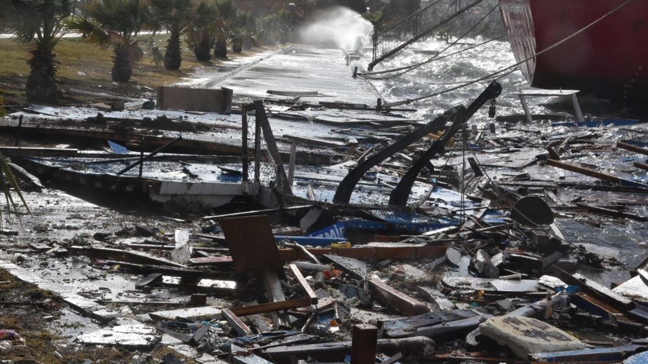 Aliağa ilçesi Yalı Mahallesindeki su iskelesinde halatla bağlı bir şekilde bulunan tekne dalgalar yüzünden parçalandı.