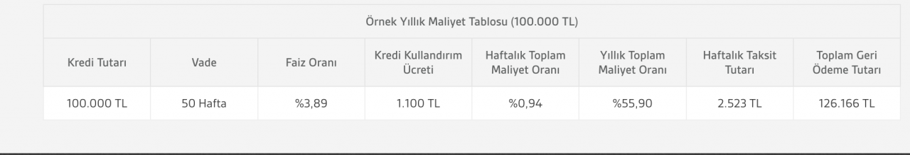 Haftalık Ödemeli Taksitli Ticari Kredi kampanyası kapsamında kullanılacak maksimum kredi tutarının 5.000.000 TL, maksimum vadenin ise 50 hafta olduğunu belirtiriz.