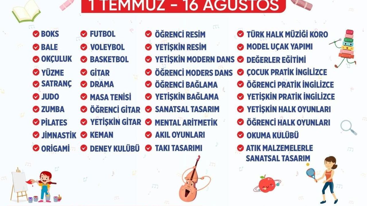 Futboldan basketbola, yüzmeden tekvandoya, masa tenisinden boksa kadar 17 ilçede 32 farklı branşta verilecek kurslarda, çocuklar tatillerini verimli bir şekilde geçirirken, aynı zamanda yeni beceriler kazanacak. Büyükşehir Belediyesi de açtığı bu kurslar ile çocukların yaz tatillerini dolu dolu geçirmelerini ve kendilerini geliştirmelerini destekleyen önemli bir kaynak olmaya devam edecek. Açılan bu kurslar kişisel gelişimin yanı sıra çocukların takım çalışması ve disiplin gibi önemli becerileri kazanmasına da imkan sunacak.
