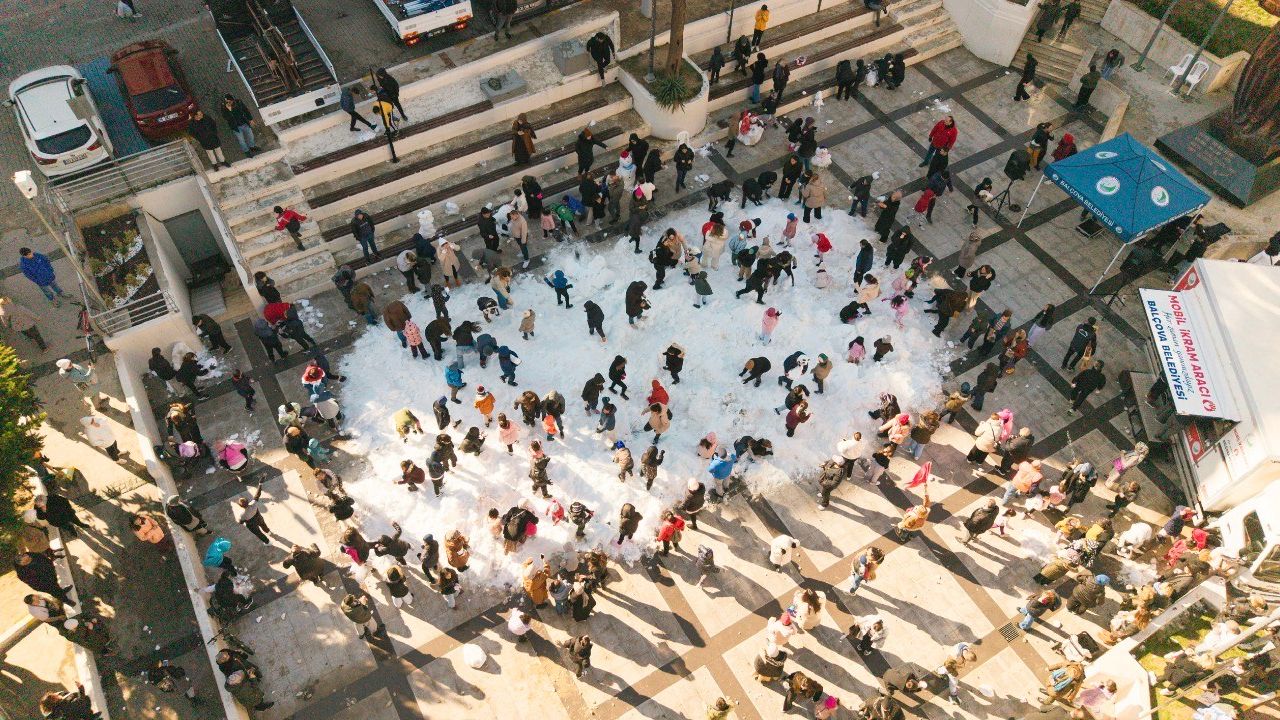 İzmir’de nadir görülen kar yağışını çocuklarla buluşturmak amacıyla gerçekleştirilen etkinlik, kısa sürede yoğun ilgi gördü. Belediye binası önünde kurulan alanda çocuklar kar topu oynadı, aileler ise bu keyifli anları cep telefonlarıyla kaydetti. Renkli görüntülere sahne olan şenlikte, neşe ve kahkaha eksik olmadı.