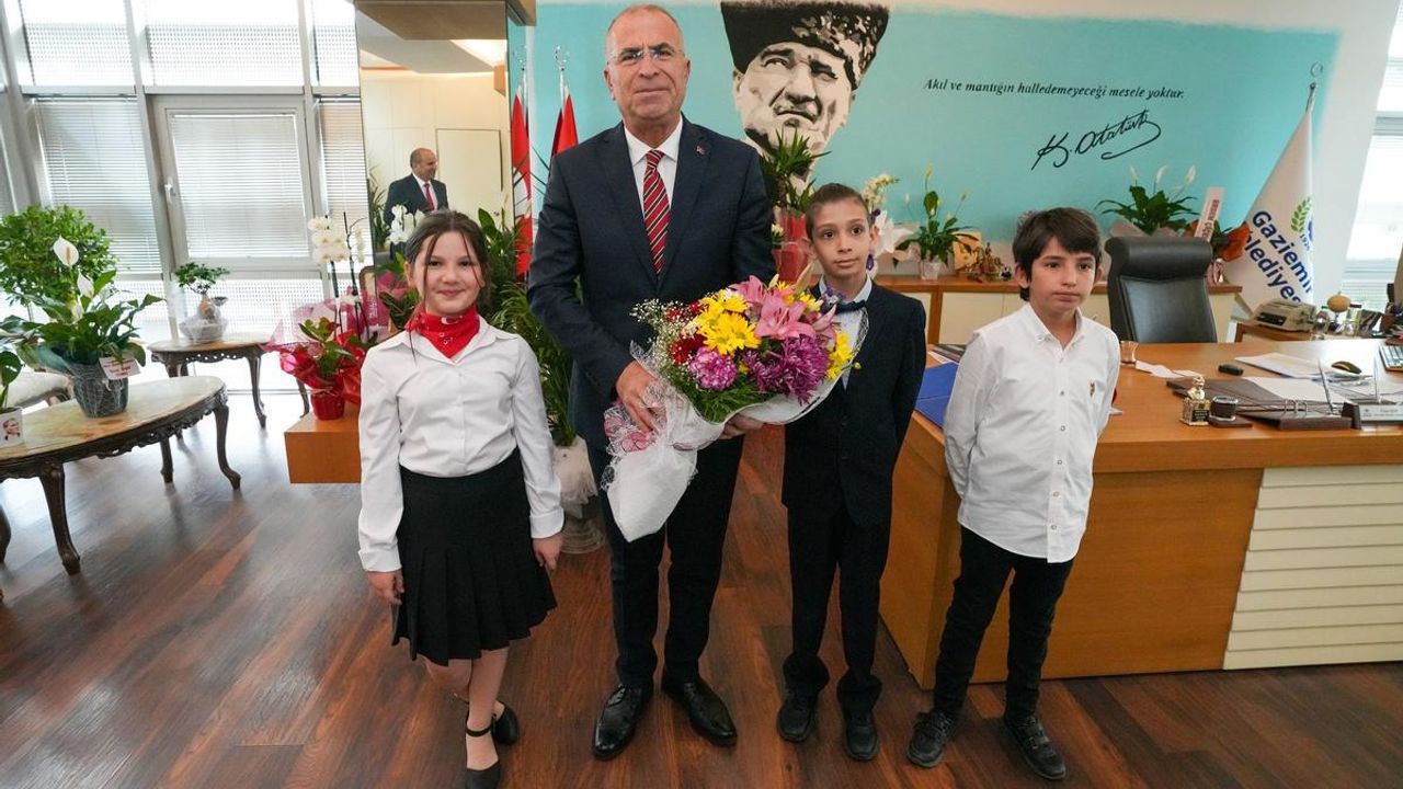 Gaziemir Belediye Başkanı Ünal Işık, 23 Nisan Ulusal Egemenlik ve Çocuk Bayramı nedeniyle koltuğunu üç öğrenciye bıraktı. İlkokul 4. sınıf öğrencileri Alya Su Gücün, Ahmet Deniz Faraş ve Aybars Tuna Kurnaz sırayla belediye başkanlığı koltuğuna oturdu.