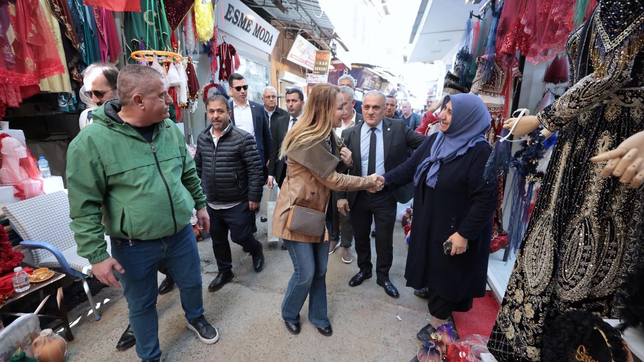 Nilüfer Çınarlı Mutlu, İzmir’in simge noktalarından biri olan Tarihi Kemeraltı Çarşısı’nda esnaf ve vatandaşlarla bir araya geldi. Çarşıyı adım adım gezen Mutlu’ya belediye bürokratlarının yanı sıra Konak Mahalle Muhtarı Tamer Yıldırım, İzmir Terziler ve Konfeksiyoncular Odası Başkanı Mustafa Güvenli, İzmir Kuyumcular Odası Başkanı Murat Kurtuluş Buyrukçu ve Kemeraltı Çarşı Esnaf Koruma Derneği Başkanı Zafer Bilici eşlik etti.