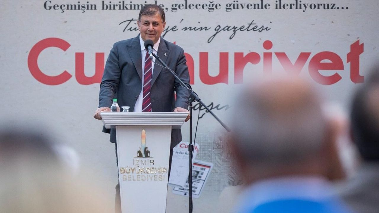 Etkinlikte konuşan İzmir Büyükşehir Belediye Başkanı Dr. Cemil Tugay, “Dünyada kaç tane gazete 100 yaşına varabilmiştir? Daha önemlisi 100 yıllık süreç içinde çizgisinden adeta bir santimetre bile sapmadan savunduğu yüce değere böylesine sahip çıkabilmiştir, bilmiyorum. Cumhuriyet denince bizim aklımıza haince, affedilmez bir şekilde katledilmiş o değerli, güzel insanlar gelir. Dün Genel Başkanımız ‘Cumhuriyet’in şehitleri’ demiş. Aynı ifadeyi ben de kullanmak isterim. Gerçekten aklımıza hepimizin şehitleri olan o güzel insanlar gelir. Her birisini üzüntüyle, acıyla ama bir o kadar da onur ve saygıyla hatırlıyoruz. Bugün biraz özgürlüğümüz, demokrasimiz, halen laikliğimiz, halen geleceğe dair umudumuz varsa onlar ve onlar gibi insanların eseridir. Hakları asla ödenmez. Bir diğer tarafta da şöyle insanlar geliyor aklıma; Cumhuriyet Gazetesi’ni katlayıp koltuğunun altına koyan, onu bütün gün gezdiren, sadece kendisi okumakla kalmayıp başkalarına da okutan o güzel, değerli insanlar. Muhtemelen onlar buradalar” dedi.