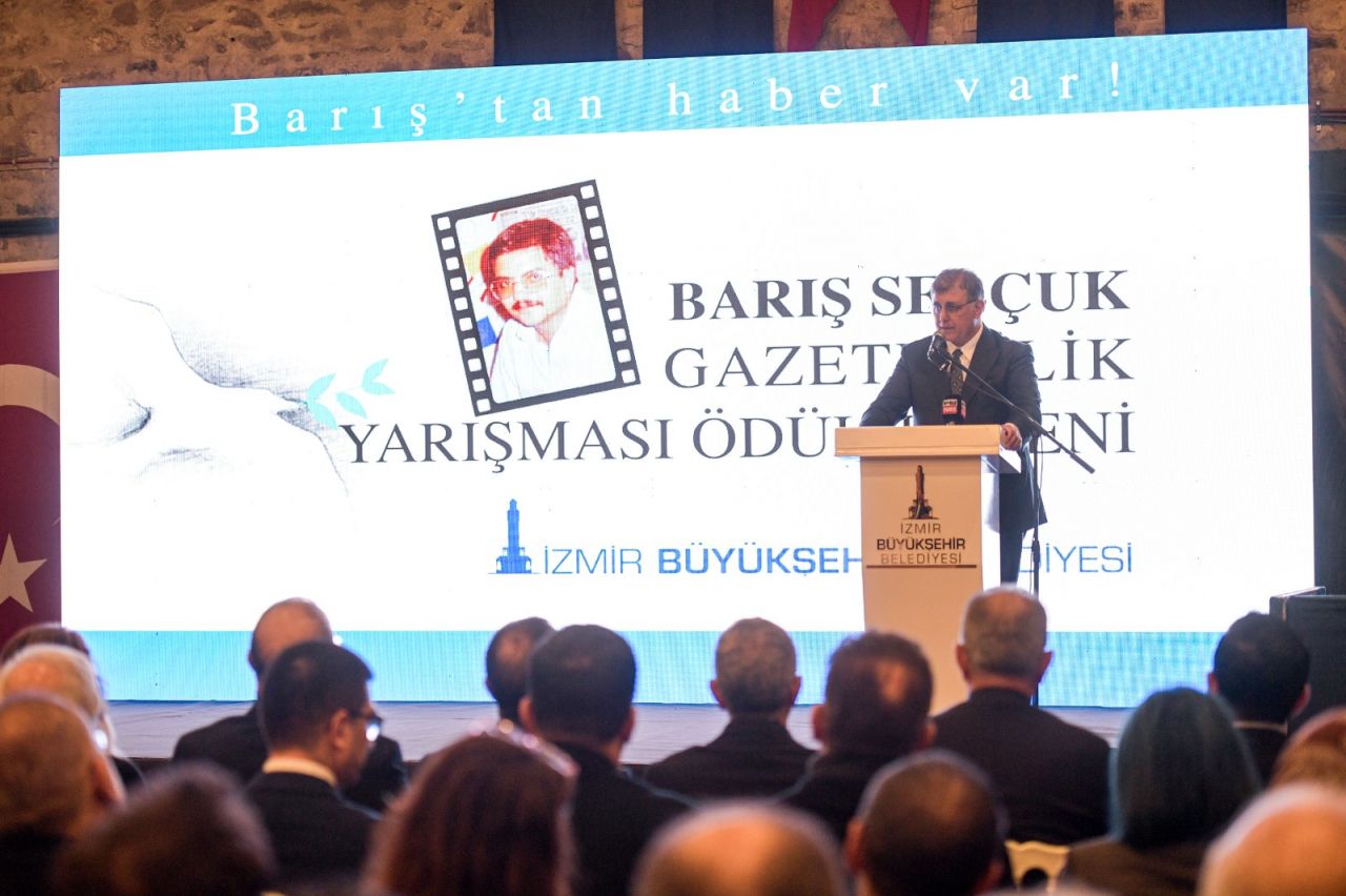 Törende konuşan İzmir Büyükşehir Belediye Başkanı Dr. Cemil Tugay, gazetecilik mesleğinin zorluklarına dikkat çekerek “Gazetecilik savaş meydanlarında, çatışmalı alanlarda, kışın soğuğunda, yazın sıcağında, herkes uyurken, tatil yaparken geceyi gündüze bağlayarak, uzun çalışma saatlerine razı, evden, aileden uzak kalarak, hak edilenden düşük ücretlerin alındığı zor bir meslek. Üstelik hepsinin ötesinde hayati risk taşıyor. Gerçekleri ortaya çıkarmanın bedeli bazen parmaklıklar ardına atılmak oluyor, bazen öldürülmek, bazen göreve giderken canından olmak olabiliyor. Tıpkı bugün burada bizi, onurlu ismi altında toplayan gazeteci Barış Selçuk gibi. Saygıyla andığımız Barış Selçuk, haber takibi sırasında hayatını kaybedeli 30 yılı geçti. İzmir’de yetişen, Ankara’ya transfer olan başarılı bir gazeteciydi. 5 Ağustos 1994’te haber için çıktıkları bir gezide ekipçe trafik kazası geçirdiler. Muhabir Hande Mumcu, kameraman Salih Peker ve araç sürücüsü Hacı Ali Er ile birlikte hayatını kaybetti. Gazetecilik onurunu, çabasını, etiğini gazetecilere miras bıraktılar. Onların adlarını yaşatmak bizim boynumuzun borcudur. Barış Selçuk ve Hande Mumcu’nun anısını yaşatmak, genç gazetecileri teşvik etmek ve başarılarını ödüllendirmek amacıyla çeyrek asırlık bir gazetecilik geleneğini sürdürmekten onur duyuyorum” diye konuştu.