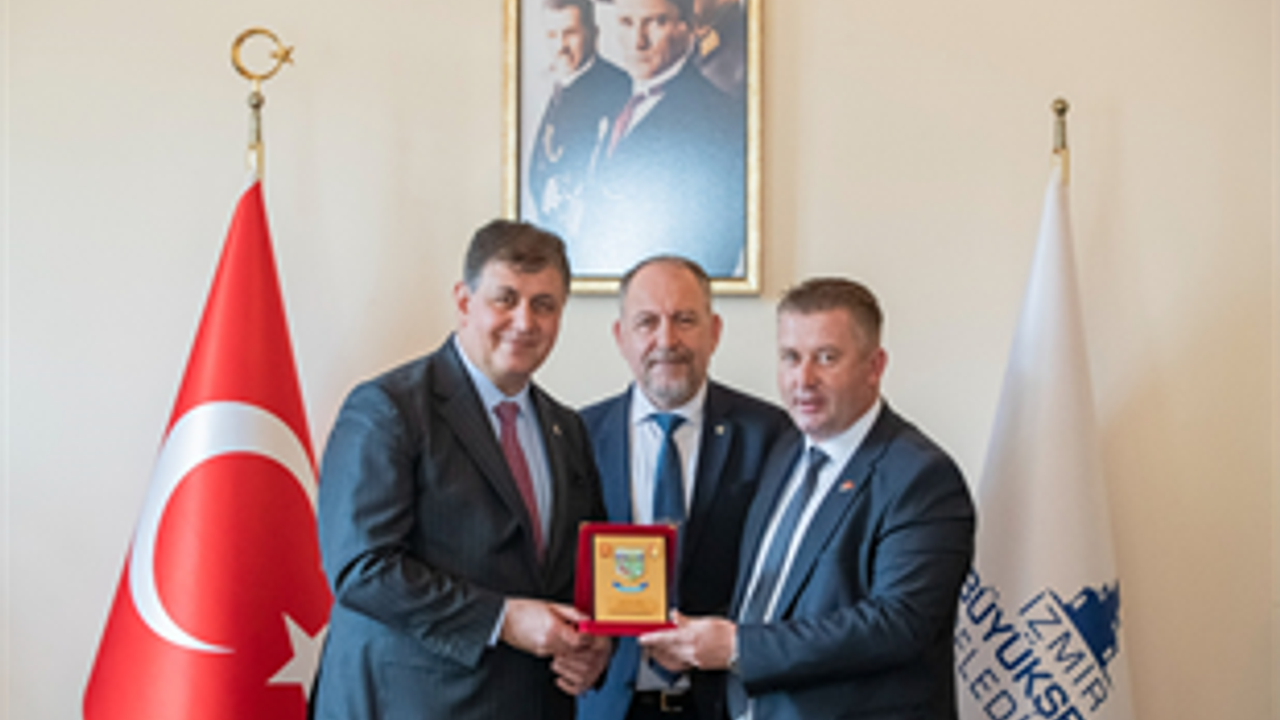 Makedonya Göçmenleri Kültürünü Yaşatma ve Dayanışma Derneği (MAK-GÖÇ) aracılığıyla Kuzey Makedonya Cumhuriyeti’nden gelen K. Makedonya Cumhuriyeti Di̇aspora i̇le İş Bi̇rli̇ği̇ Ulusal Koordi̇natörü Faton Asani, Çaşka Belediye Başkanı Goran Stojanovski, Kriva Palanka Belediye Başkanı Sasko Mitovski ve beraberlerindeki heyet İzmir Büyükşehir Belediye Başkanı Dr. Cemil Tugay’ı ziyaret etti.