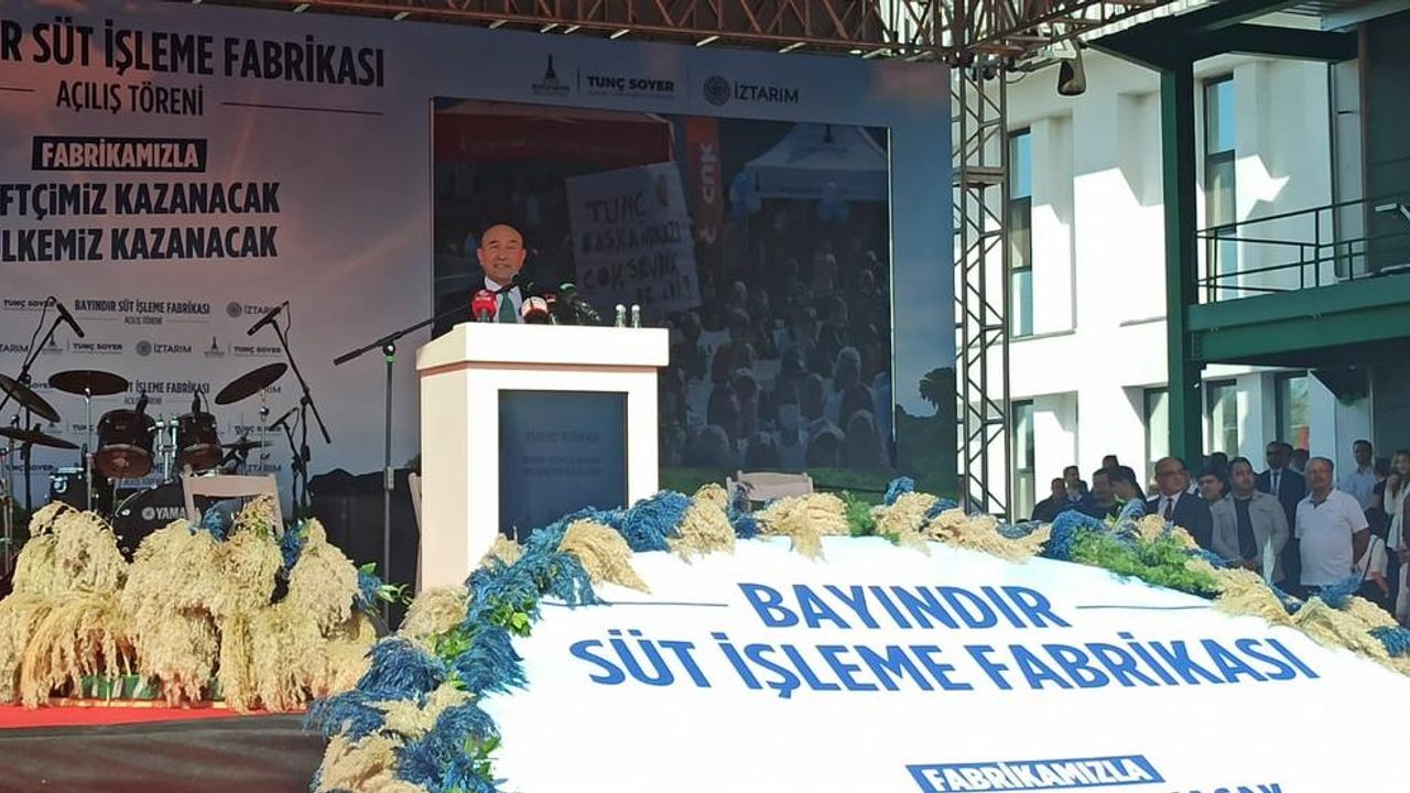 Bayındır Süt İşleme Fabrikası’nın isminin ‘Bayındır 100. Yıl Süt İşleme Fabrikası’ olarak isim belirlediklerini söyleyen Soyer, Silajlık mısırdan kurtulmamız lazım. Et fiyatları ucuzlasın istiyorsak GDO’lu silajlık mısırdan bu ülkeyi kurtarmamız lazım. Çocuklar yatağa aç girmesin istiyorsak silajlık mısırı bırakmamız lazım. Küçük Menderes Havzası çöl olmasın istiyorsak, mısır silajını terk etmemiz lazım. Bir tanesi 85 beş litre su tüketen bu ürün iliğimizi kemiğimizi kuruttu. Ülke topraklarımızı, vatanımızı seviyorsak silajlık mısıra savaş açmamız lazım. Çünkü bu ürün yüzünden dağlarımızda yerli hayvan ırklarının otladığı meraları terk ettik. Onun yerine ovalara taşındık. Buğday, meyve, sebze üretilen bereketli ovalarımızda artık sadece mısır tarlaları var. Hükümetin ısrarla desteklediği bu üretimin arkasında kimlerin olduğunu çok iyi biliyoruz. Kirli postallarıyla işgal edemedikleri topraklarımızı, şimdi tohumlarıyla gasp etmek istiyorlar. Fakat iyi bilsinler. İzmirli bu oyuna gelmez! Artık İzmir Bayındır’da yükselen bir Cumhuriyet kalesi var. Bu kale, topraklarımız yeniden özgürlüğüne kavuşsun diye var! Göreceksiniz, bu kale, yerli ve milli tohumlarımızı yeniden toprakla buluşturacak. Başka bir tarımının mümkün olduğunu İzmir’den tüm dünyaya gösterecek. Ne mutlu bize ki İzmir’de “Başka bir tarım mümkün” diyerek başlattığımız devrim, bu Cumhuriyet kalesinde ölümsüzleşti. Artık İzmir’de geçim derdi yaşayan tek bir çoban, umut ışığının söndüğü tek bir ağıl, bereketin eksik olduğu tek bir tarla kalmayacak.