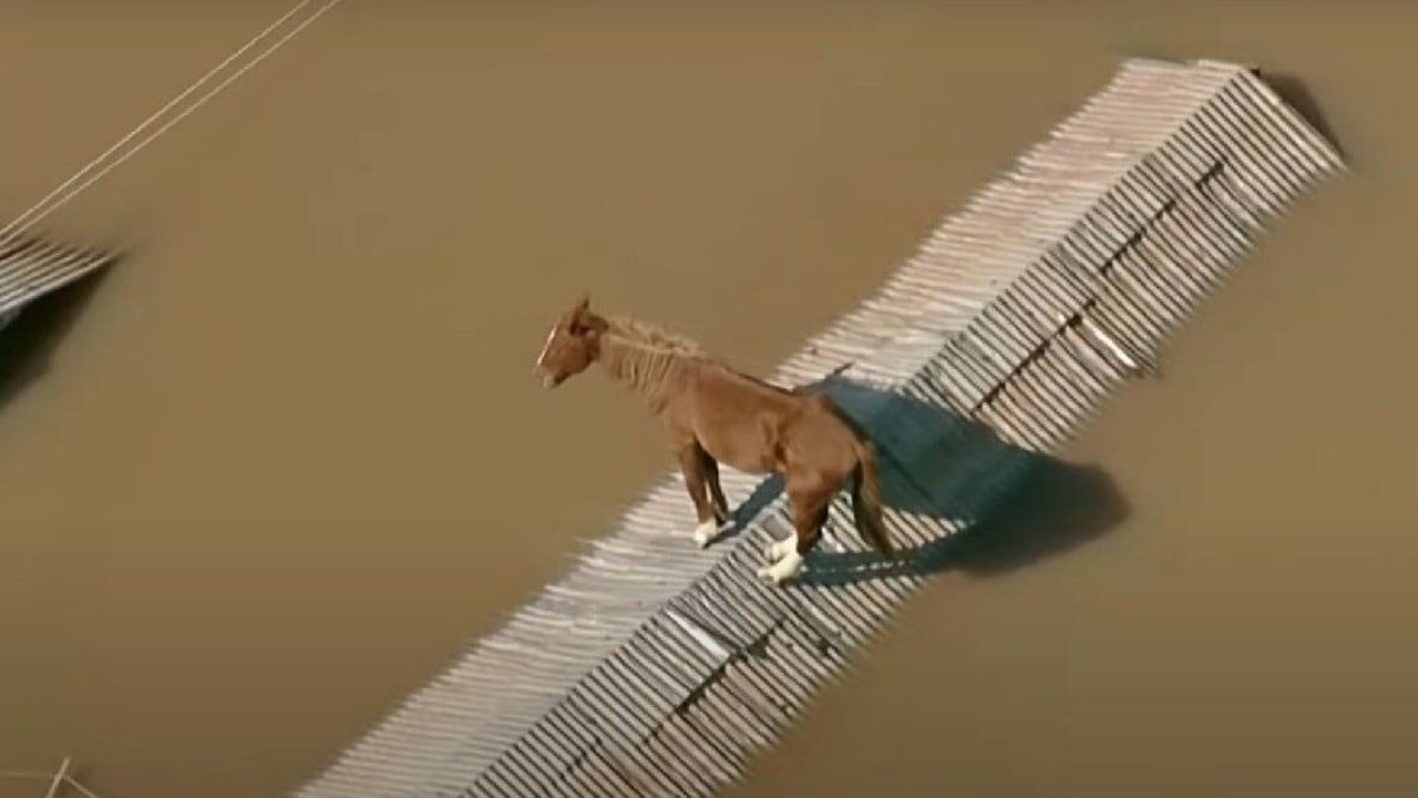 Caramelo ismi verilen at, dar bir çatıda dengede durarak uzun süre yardım gelmesini bekledi. Kurtarma ekipleri ata dün ulaşarak botla güvenli bir yere taşıdı.