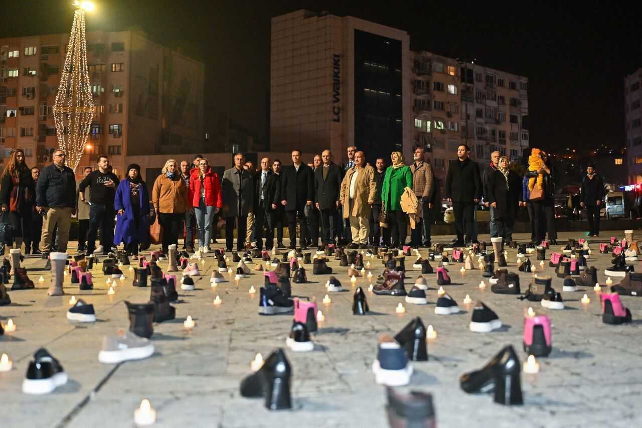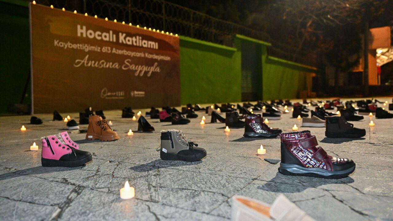 Gündüz Azerbaycan Dostluk Parkı’nda gerçekleştirilen programın ardından akşam saatlerinde Bornova Cumhuriyet Meydanı’nda anlamlı bir anma töreni düzenlendi. Katliamda hayatını kaybedenler için 613 çift siyah ayakkabı sergilendi.