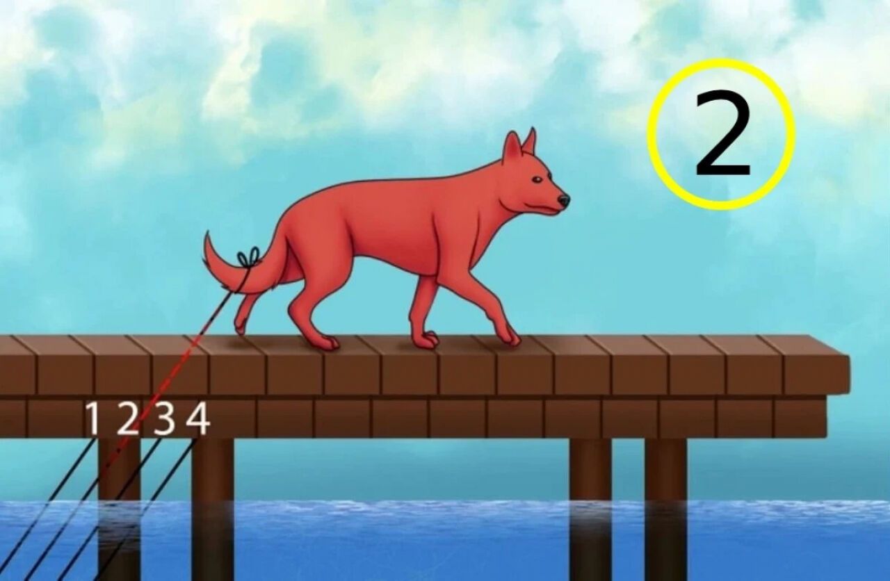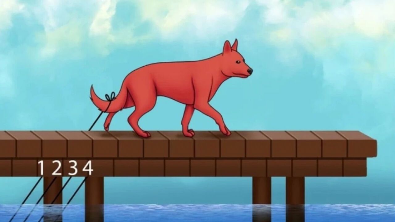 Aşağıdaki görselde bir köpek, tahta bir köprü üzerinde yürürken kuyruğuna bağlı bir ip sarkıyor. Ancak aşağıya uzanan iplerden sadece biri köpekle bağlantılı. Görev basit ama zaman kısıtlı: Doğru ipi 5 saniyede bulmanız gerekiyor.