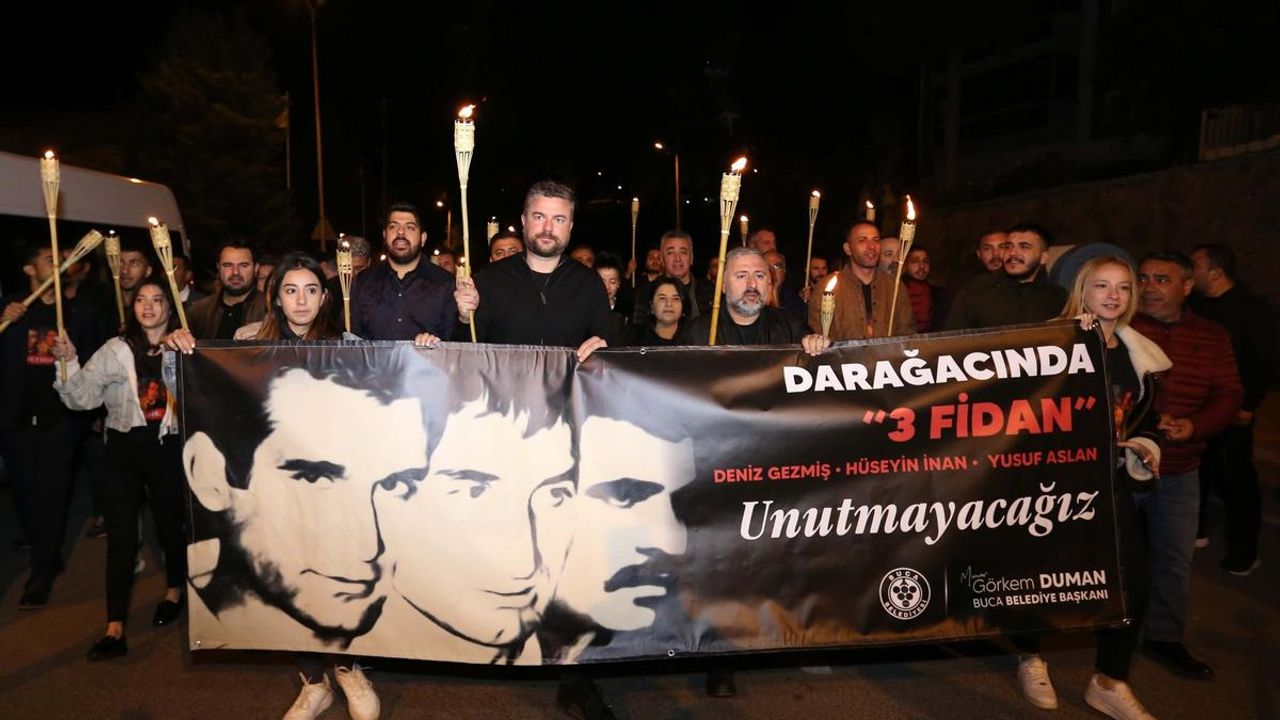 Anma töreni için Buca Tenis Kulübü önünde toplanan Bucalılar, Üç Fidan Anıtı önüne kadar ellerinde meşaleler ve pankartlar eşliğinde yürüdü. Anıtın önünde, Deniz Gezmiş ve arkadaşlarının mücadelesini anlatan belgesel gösterimi yapıldı. Daha sonra, idamların gerçekleştiği saat 05.30’da saygı duruşu gerçekleştirildi. Saygı duruşunun ardından da Üç Fidan Anıtı’na kırmızı karanfil bırakıldı.