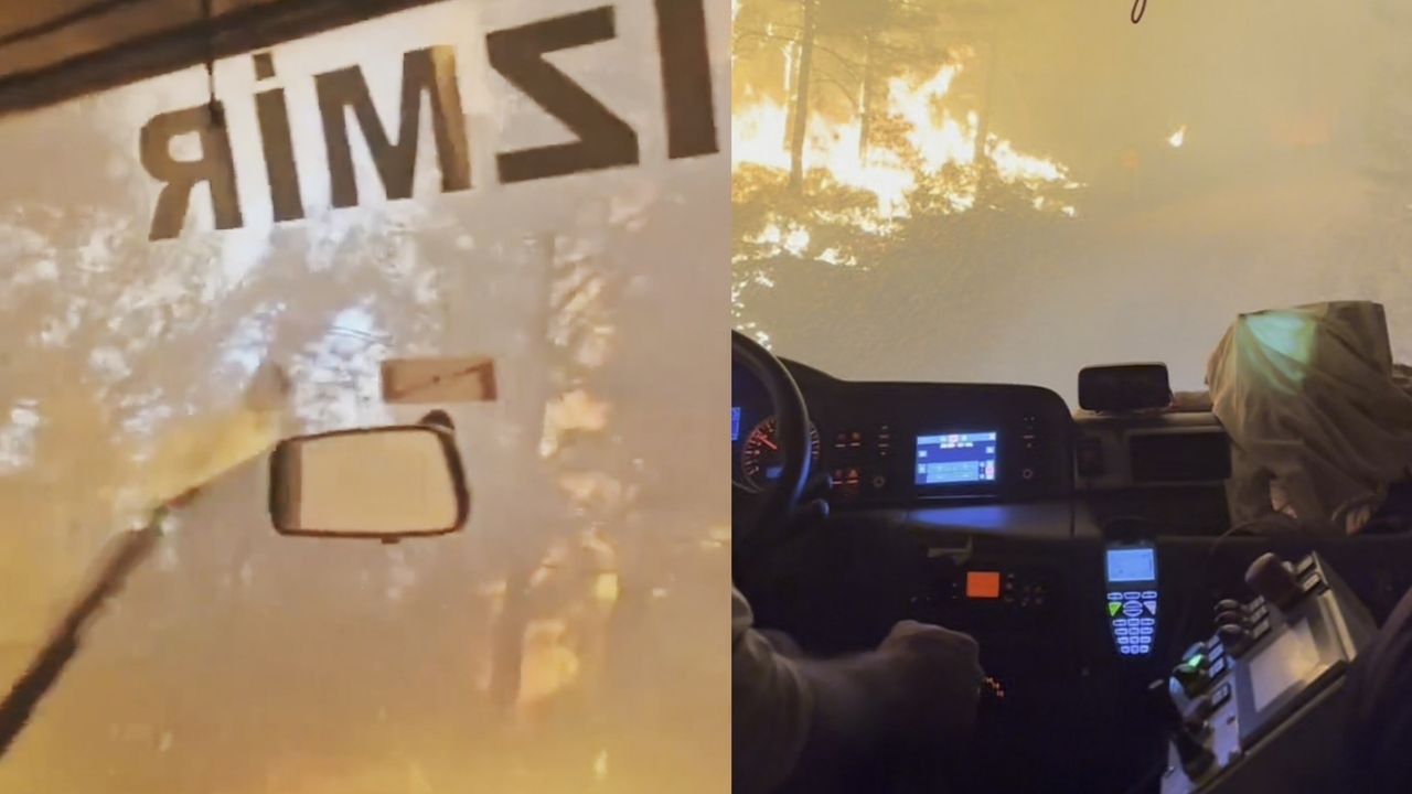 En kritik anlardan biri, İzmir Orman Bölge Müdürlüğü’ne ait bir arazözün metrelerce yüksekliğe ulaşan alevlerin arasında kalmasıyla yaşandı. Yangının tam ortasında kalan araç ve içindeki söndürme ekibi, kısa sürede kapana kısıldı. Ancak arazöz şoförü, soğukkanlı bir şekilde geri manevra yaparak aracı alevlerin arasından çıkarmayı başardı. Ekip, herhangi bir zarar görmeden bölgeden uzaklaştı.