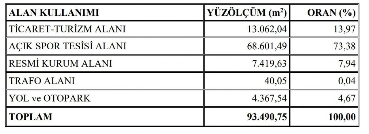 İmar planına göre; İzmir Çeşme Otoyoluna komşu hazine mülkiyetindeki 93 bin 490 metrekarelik alan "Ticaret-Turizm Alanı (E: 0.60 Yençok: 2 Kat), Açık Spor Tesis Alanı (E: 0.15, Yençok: Projenin gerektirdiği yükseklik), Resmi Kurum Alanı (E: 0.40, Yençok: 2 Kat), Trafo Alanı, Otopark ve Yol" ilan edildi.