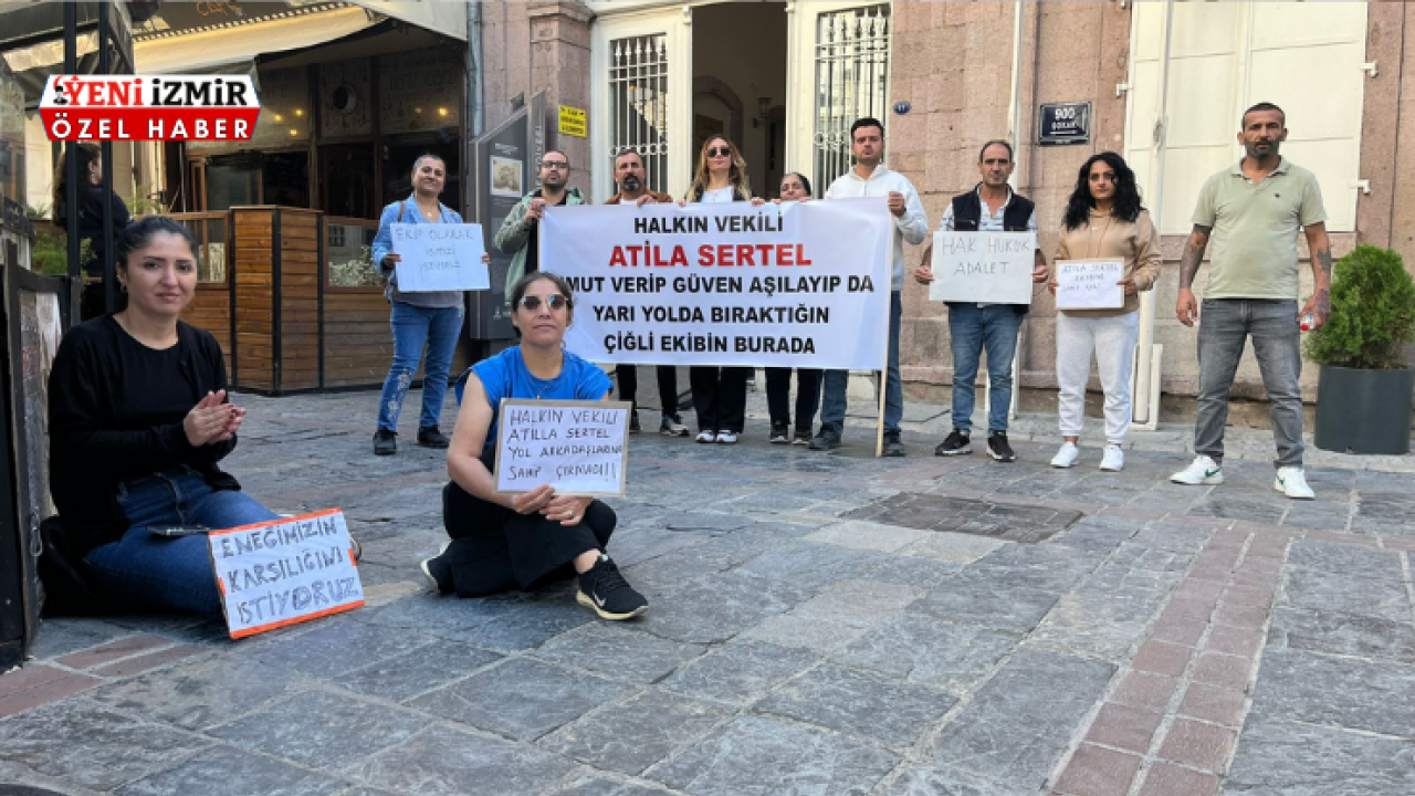 Grup eylem kapsamında Egemenlik Binası önünde üzerinde, "Halkın vekili Atila Sertel, umut verip güven aşılayıp da yarı yolda bıraktığın Çiğli ekibi burada", "Halkın vekili Atila Sertel yol arkadaşlarına sahip çakmadı" yazılı pankartlar açtı.