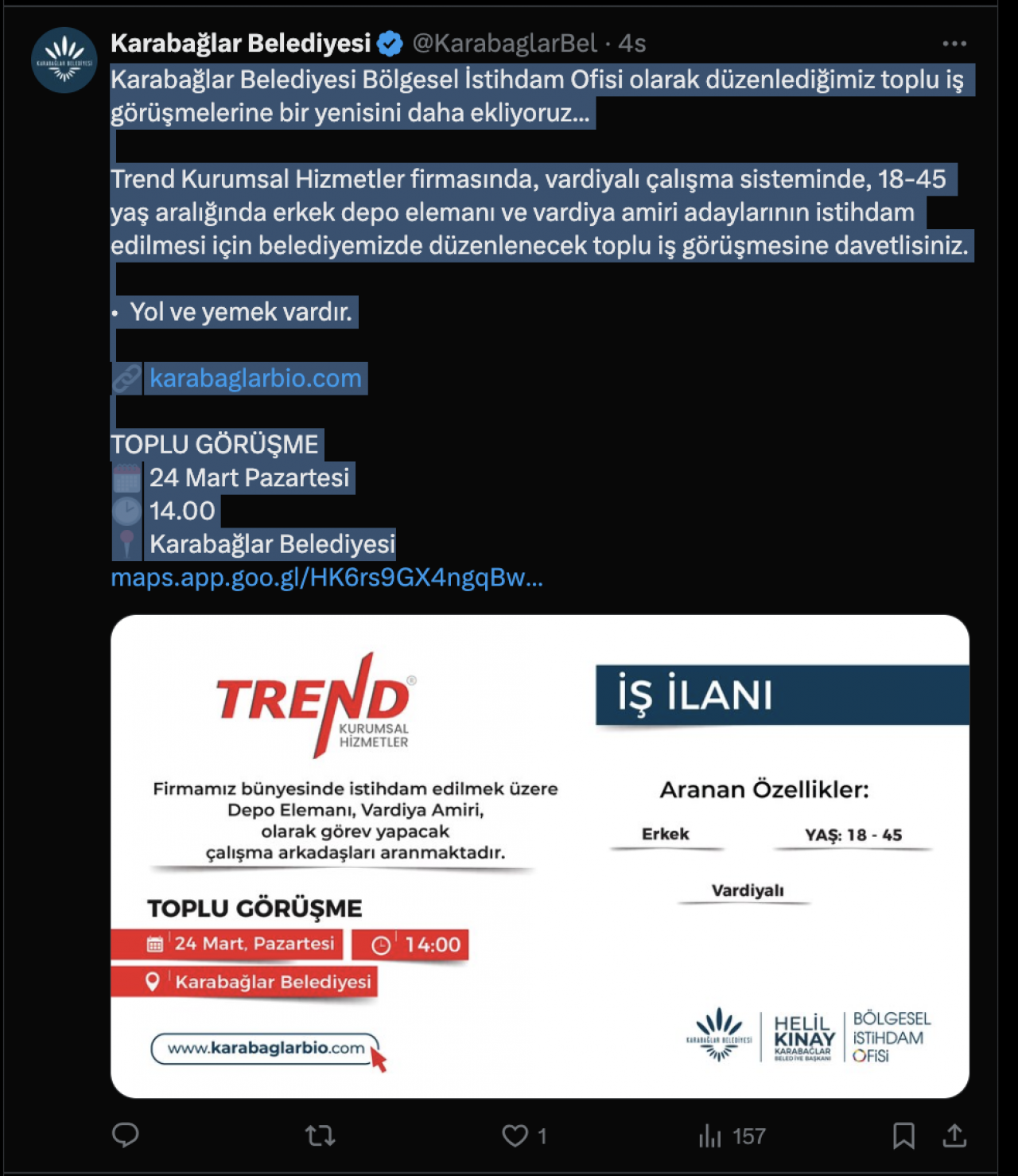 Trend Kurumsal Hizmetler firmasında, vardiyalı çalışma sisteminde, 18-45 yaş aralığında erkek depo elemanı ve vardiya amiri adaylarının istihdam edilmesi için belediyemizde düzenlenecek toplu iş görüşmesine davetlisiniz.