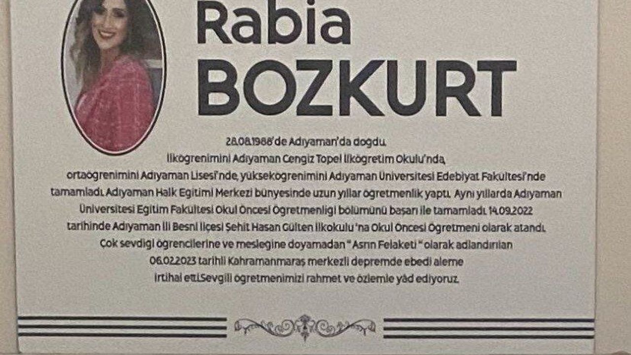Uzun yıllar boyunca Adıyaman Halk Eğitim Merkezi’nde de öğretmenlik yapan ve daha sonra Besni Şehit Hasan Gülten İlkokuluna öğretmen olarak atanan Rabia Bozkurt, atandıktan 3 ay sonra meydana gelen 6 Şubat depreminde hayatını kaybetti. Öğrencileri ve meslektaşları tarafından oldukça sevilen Rabia Bozkurt’un ismi okulunda öğretmenlik yaptığı sınıfa verildi.