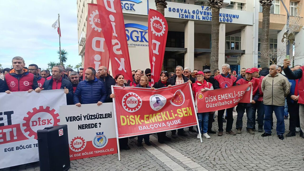 DİSK Ege Bölge Temsilciliği, İzmir Konak SGK binası önünde düzenlediği basın açıklaması düzenledi.