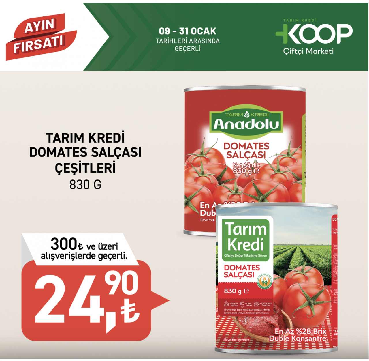 Tarım Kredi Kooperatif Market zaman zaman kampanya duyurularında bulunuyor. İnternet sayfası üzerinden salçasını marketten almayı tercih edenleri ilgilendiren bir duyuru yaptı. Yayınlanan afişlere göre, domates salçası 9 Ocak tarihinden, 31 Ocak tarihine kadar kampanyalı olarak satılacak. Kampanyadan ise 300 TL ve üzeri alışveriş yapanlar faydalanabilecekler.