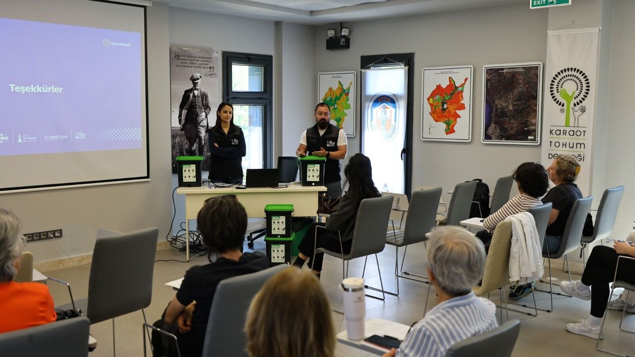 Kimya Mühendisi Merve Bodur Keskin tarafından verilen eğitimde, mutfak atıklarından kompost gübre üretiminin yöntemleri katılımcılarla paylaşıldı. Eğitim kapsamında ilk olarak İzmir Büyükşehir Belediyesi Tarımsal Hizmetler Dairesi Başkanlığı’nın yürüttüğü “İyi Tarım” uygulamaları hakkında bilgilendirme yapıldı.