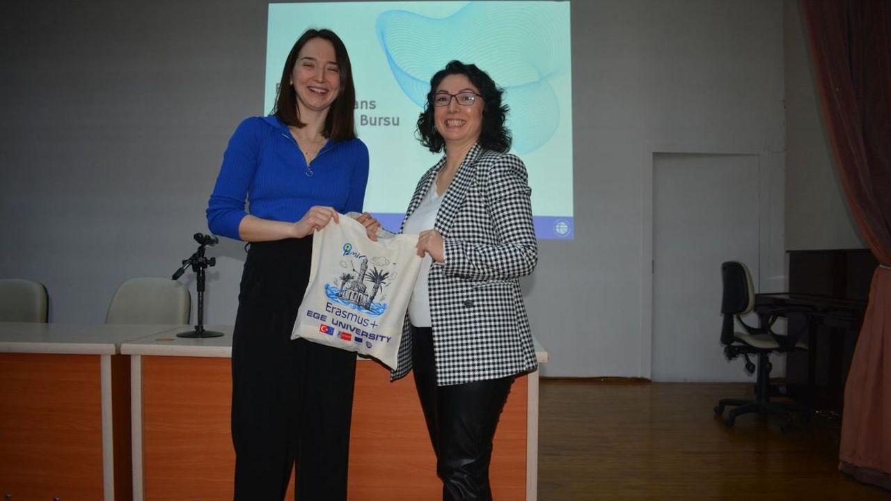Katılımcılara, burs programlarına başvuru şartlarını ve burs almak isteyen kişilerin sahip olması gereken donanımları anlatan Ecem Mutlu, programa katılmak isteyen öğrenci ve akademisyenlere başvuru ile ilgili dikkat edilmesi gereken prosedürleri aktardı. Etkinlik sonunda Ecem Mutlu’ya Prof. Dr. Arife Candaş Adıgüzel Zengin tarafından günün anısına hediye takdim edildi.