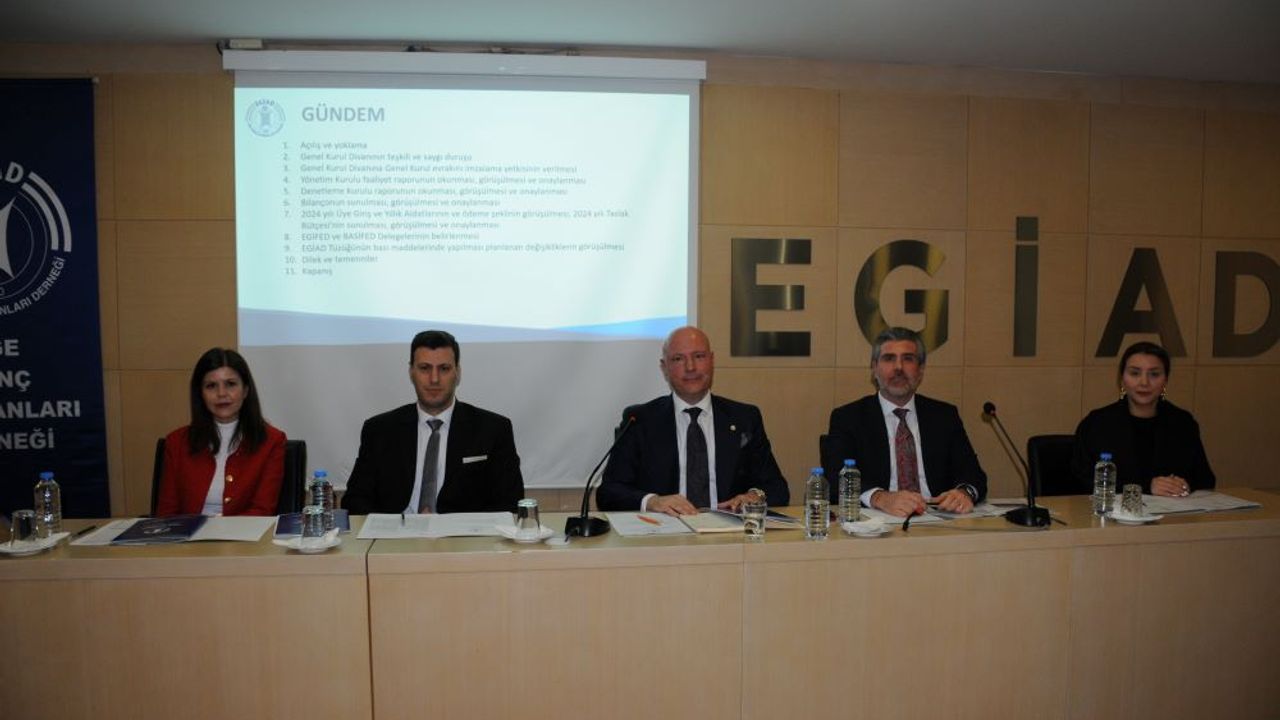 EGİAD Olağan Mali Genel Kurul Toplantısı EGİAD Dernek Merkezinde gerçekleştirildi. Divan Başkanlığı’nı geçmiş dönem Başkanı Mustafa Aslan; Divan Başkan Yardımcılığını Süleyman Tutum ve Divan Üyeliklerini Orçun Tan, Begüm Soydan Sayılkan, Yeşim Şanal’ın gerçekleştirdiği toplantıda EGİAD Yönetim Kurulu Başkanı Alp Avni Yelkenbiçer tarafından yıllık faaliyet raporu paylaşıldı.