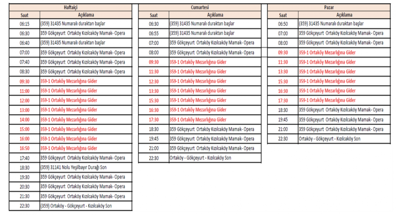 Mevcut güzergahımızdaki EGO Cepte sorunlarının giderilmesi ve vatandaşların memnuniyetlerinin artırılması için, Ankara Büyükşehir Belediyesi Ortaköy Mezarlığına gidecek yolcularımız için 359-1 Gökçeyurt- Ortaköy- Ortaköy Mezarlığı- Kızılcaköy- Mamak- Opera hattı açılmış olup, 07.03.2025 tarihinden itibaren aşağıda belirtilen güzergah ve servis saatleri ile hizmet verilecektir. Kuruluşumuzun resmi internet sitesi ve EGO CEPTE mobil uygulaması üzerinden güncel olarak ulaşabilirsiniz.Not: 359 Gökçeyurt – Ortaköy- Kızılcaköy- Mamak- Opera hattımızın güzergahı ve servis saatleri ile ilgili herhangi bir değişiklik yapılmamıştır.
