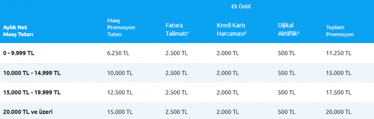 Promosyon Taahhütnamesi'nin imzalanması sonrasında ek bir koşul olmadan; bir aylık net gelir 9.999 TL'ye kadarsa 6.250 TL; 10.000 TL - 14.999 TL arasındaysa 10.000 TL; 15.000 TL - 19.999 TL arasındaysa 12.500 TL; 20.000 TL' nin üzerindeyse 15.000 TL nakit promosyon ödenir.