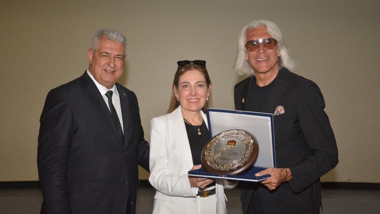 İzmir Emlakçılar Odası üyelerinin büyük ilgi ve katılım göstererek takip ettiği seminer sonunda oda başkanı Mesut Güleroğlu, kendisi de bir emlakçı olan eşi İzmir Ticaret Odası Meclis Üyesi Dilek Güleroğlu ile birlikte Dr. Sinan Ergin’e bir plaket de takdim etti.