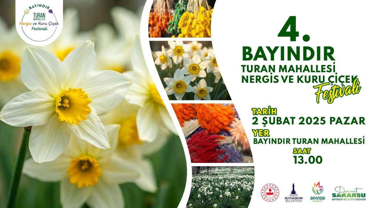 Bu sene 4. kez kez düzenlenecek Bayındır Turan Mahallesi Nergis ve Kuru Çiçek Festivali 2 Şubat Pazar günü Turan Mahallesi meydanında gerçekleşecek ve saat 13.00’de başlayacak. Halk oyunları gösterisi ve çeşitli etkinliklerin de yapılacağı festivalde saat 14.30’da İZBB Pop Orkestrası Konseri yapılacak ve saat 16.00’da da Feridun Düzağaç sahne alacak.