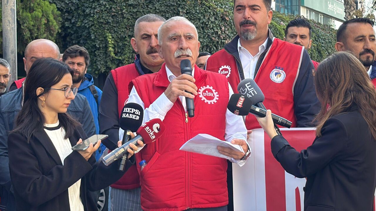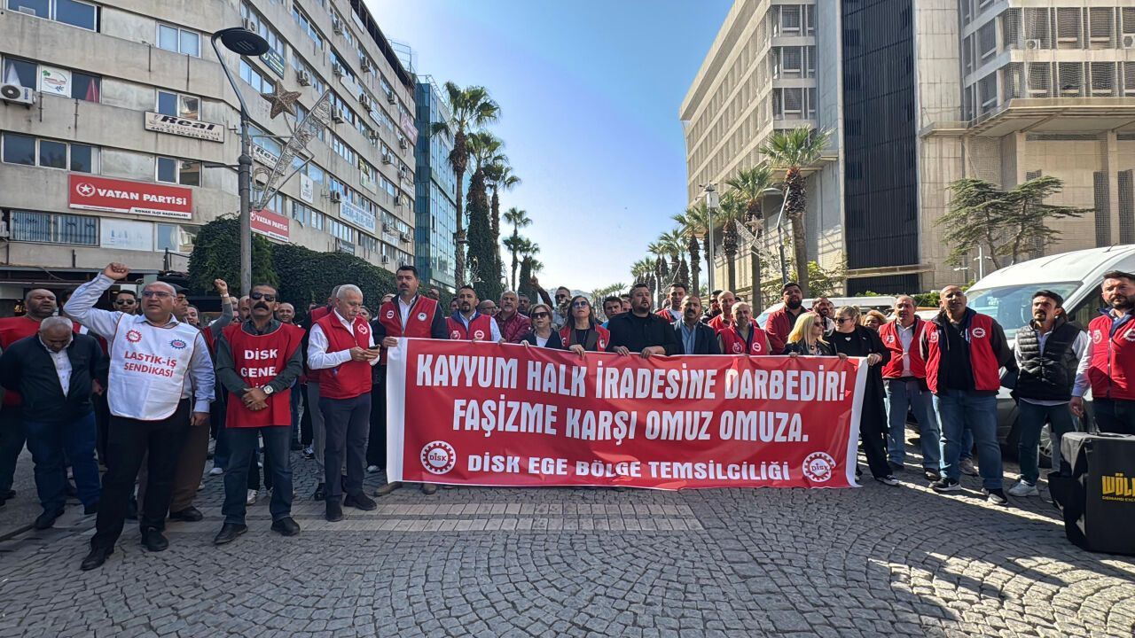 DİSK Ege Bölge Temsilcisi Memiş Sarı, burada yaptığı açıklamada, kayyum atamalarının yasal temele dayanmadığını belirterek, demokrasinin halkın temsilcilerini özgürce seçmesi ilkesine dayandığını vurguladı.