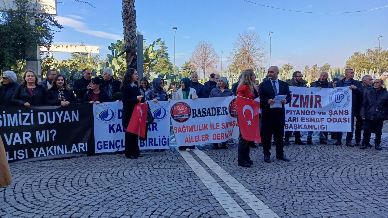 Konak'ta Turuncu Park önünde toplanan piyango ve şans oyunları esnafı ile ailelerin kurduğu dernekler sosyo ekonomik soruna toplumun dikkatini çekmeye çalıştı.