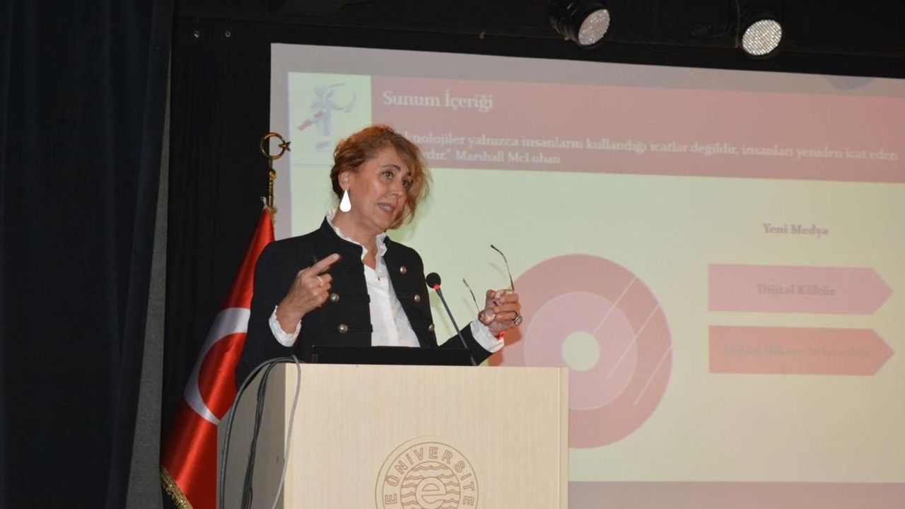 Ege Üniversitesi Güzel Sanatlar, Tasarım ve Mimarlık Fakültesi Dekanı Prof. Dr. Alev Fatoş Parsa, sunumunda yeni medya bağlamında hikâye anlatıcılığı hakkında detaylı bilgiler vererek, “Yeni medya, bütün bilinen farklı ortamları bir araya toplama yetisine sahip özelliktedir. Buna multimedya ya da çoklu ortam denilmektedir. Metin, durağan görüntü, hareketli görüntü, ses gibi ortamların birliktelikleri bu özelliği meydana getirmektedir. Bu duruma verilebilecek en iyi örneklerden biri internettir. Diğer iletişim ortamlarını kendinde barındırabilen internette; radyo, gazete, televizyon gibi medya türleri bir araya gelmektedir. Bunun sonucu olarak internette farklı bir dil oluşmaktadır. Dijital dünyada anlatım dili zaman-mekân sınırlarını ortadan kaldırarak, benliğin ve aidiyetlerin adeta yeniden kurgulanmasını sağlamasının yanı sıra yeni yaşam alanları da ortaya çıkarmıştır. Bu yeni uzamda, sanal mekânlarda toplumsal, sosyal, kültürel tüm olgular interaktif etkileşime olanak veren yapısıyla insan-insana ya da insan-makine etkileşiminde yaşanmaktadır. Hikâye anlatmak aslında bir anlatı yapısı kurmaktır. Anlatı formları insanların dünyayı anlamalarının yoludur. Özellikle medya gibi dinamikler ve yeni iletişim teknolojileri için yeni teknik formlar, yazılımlar ve yeni kodlarla farklı bir dijital anlatım dilinin oluşması gereklidir. Artık interaktif yaşamda izleyiciler yerini kullanıcı terimine bırakmıştır” dedi.