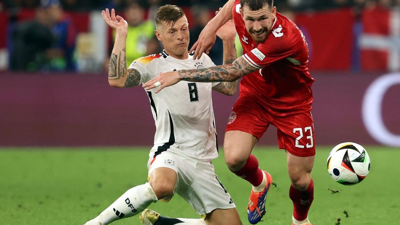 Almanya’da düzenlenen 2024 Avrupa Futbol Şampiyonası’nda (EURO 2024) Son 16 Turu’nda Almanya ile Danimarka, BVB Dortmund Stadı’nda karşı karşıya geldi. İngiliz hakem Michael Oliver yönettiği mücadele 35. dakikada yoğun yağmur ve dolu nedeniyle durdu. Bu nedenle iki takım oyuncuları soyunma odasına girdi. 35. dakikada itibarıyla karşılaşma, yağışın etkisinin azalmasıyla birlikte hakem atışıyla yeniden başladı. İlk yarı golsüz eşitlikle sona erdi. 48. dakikada Danimarka’da Andersen, topu ağlara gönderdi ancak VAR incelemesi sonucunda pozisyonun ofsayt olduğu belirlendi. 52. dakikada ceza sahası içinde Andersen’in topa elle müdahalesi sonucu VAR’ın uyarısıyla Almanya penaltı kazandı. 54. dakikada beyaz noktanın başına geçen Havertz, topu ağlara göndererek Almanya’yı 1-0 öne geçirdi. 68. dakikada atılan uzun pasla buluşan Musiala sol kanattan ceza sahasına girerek meşin yuvarlağı ağlara gönderdi ve skoru 2-0’a getirdi. İlerleyen dakikalarda başka gol olmayınca Almanya sahadan 2-0 galip ayrılarak adını çeyrek finale yazdırdı. Panzerler, çeyrek finalde İspanya – Gürcistan maçının galibiyle karşılaşacak.