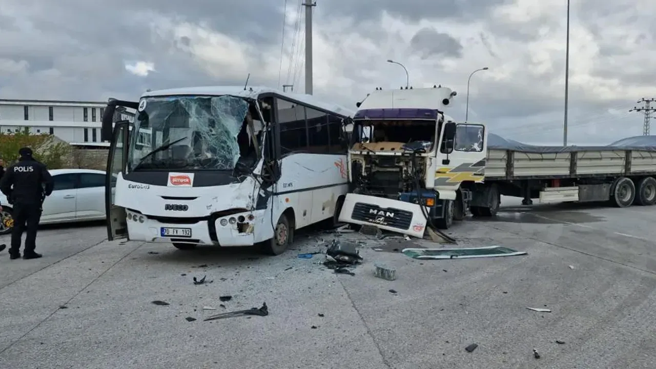 Karaman-Ereğli kara yolu üzerindeki kavşakta organize sanayi bölgesinde faaliyet gösteren bir bisküvi fabrikasına işçi taşıyan Mustafa Ç. idaresindeki midibüs, kavşakta dönüş yapan Hüseyin A. idaresindeki çelik demir yüklü tırla çarpıştı.