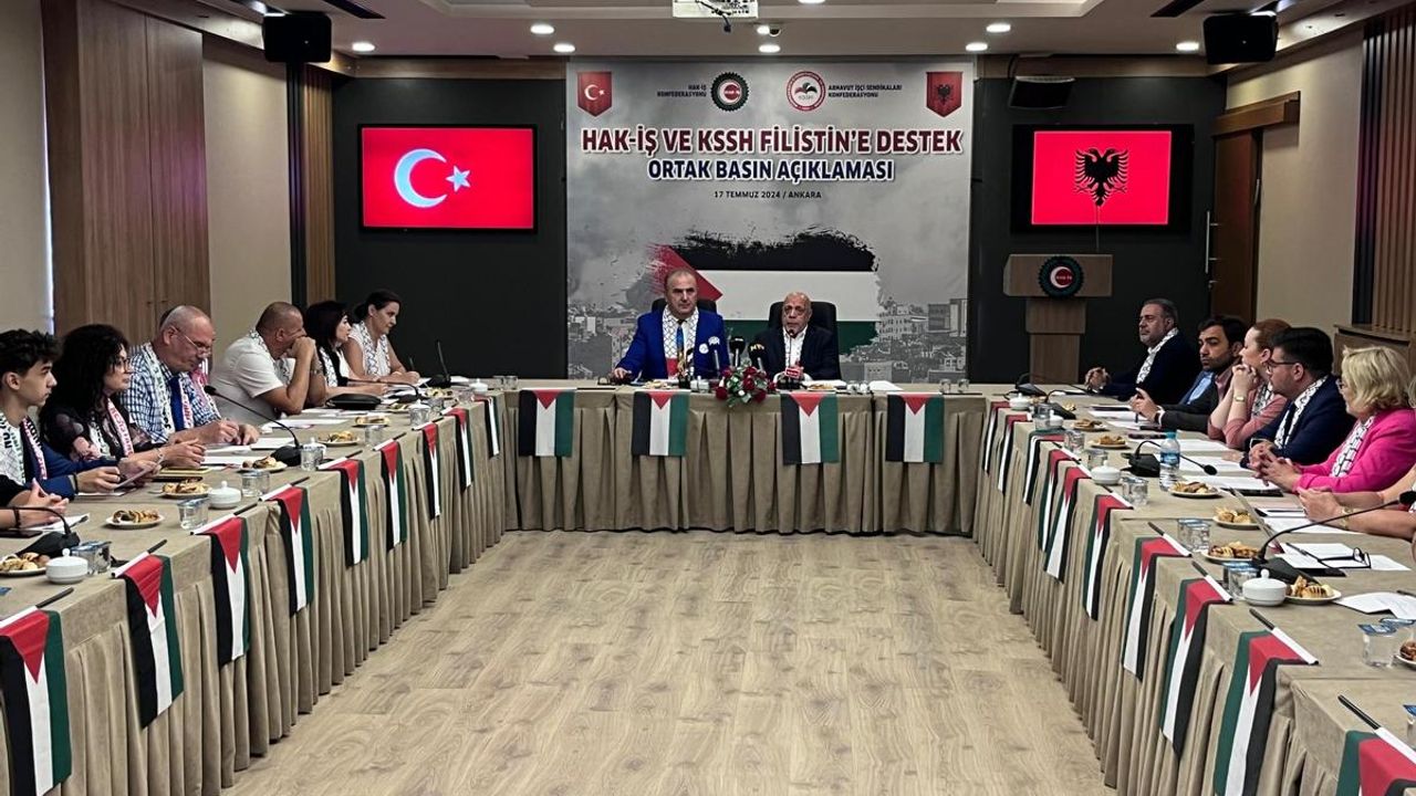 Filistin Genel Başkanı Mahmut Arslan ve Arnavutluk İşçi Sendikaları Konfederasyonu (KSSH) Genel Başkanı Kol Nikolla Filistin’e destek gündemiyle bir araya gelerek basın toplantısı düzenledi. HAK-İŞ Genel Merkezi’nde gerçekleştirilen toplantıda İsrail’in Gazze’ye yaptığı saldırıların durdurulması gerektiği vurgulandı ve Filistin’e yapılacak söz konusu yardımlar ele alındı.