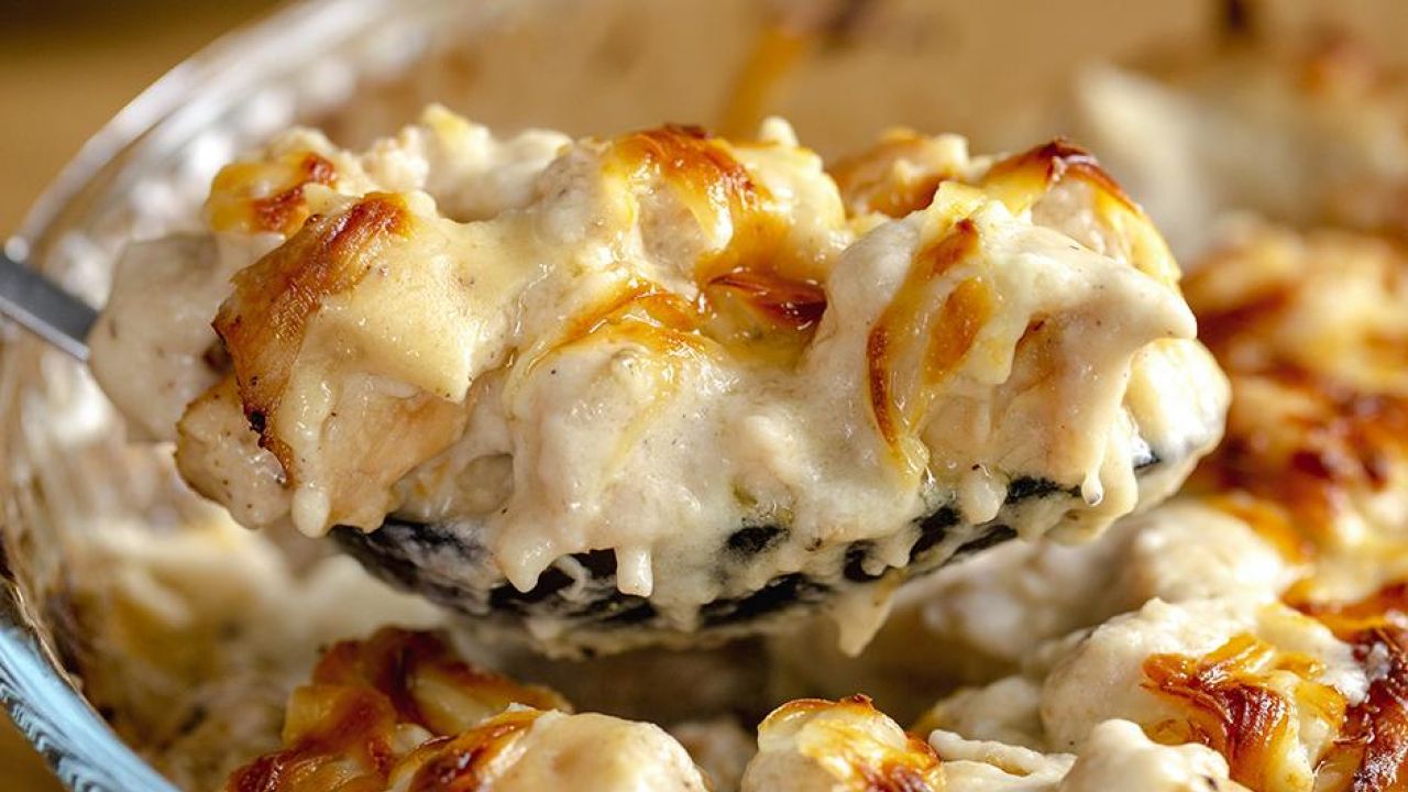 Tavuk karışımının üzerine beşamel sosu dökün, ardından bolca kaşar rendesi serpin. Önceden ısıtılmış 190 derece fırında yaklaşık 30 dakika, üzeri kızarana kadar pişirin.