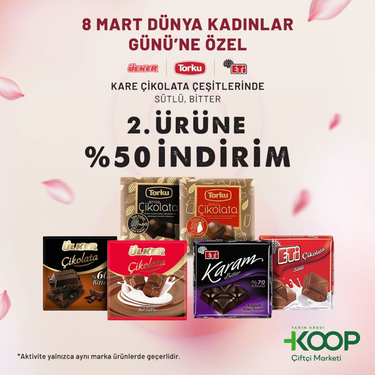 Tarım Kredi Kooperatif Market tarafından yayınlanan indirim afişine göre, Ülker, Torku, Eti kare çikolata çeşitlerinde ikinci ürüne yüzde 50 indirim uygulanacak.