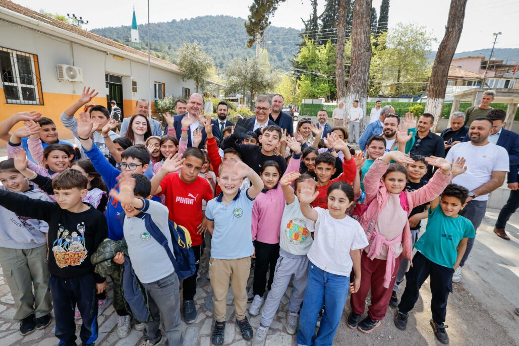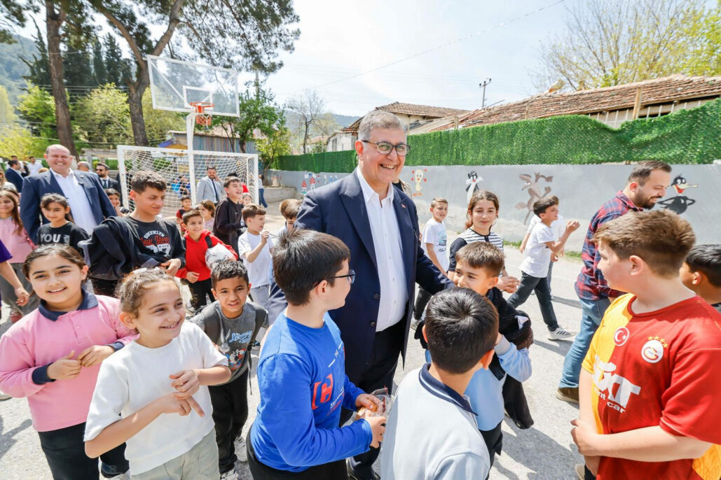 Çamönü ziyaretinde Naile Karadeniz Ortaokulu bahçesinde oyun oynayan çocuklarla sohbet eden Tugay, öğrencilerden yoğun ilgi gördü.