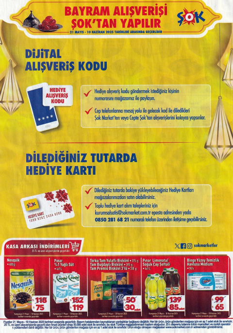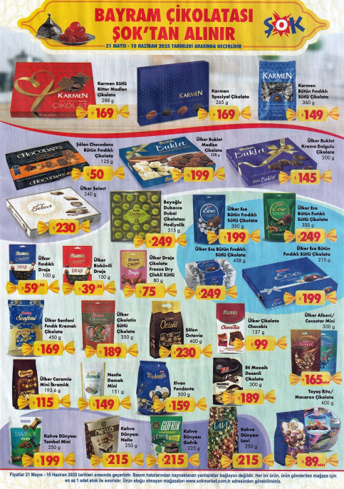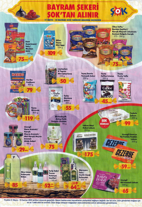 Bayram hazırlıkları sürerken, ŞOK Market yeni haftaya özel aktüel ürün kataloğunu yayınladı. 21 Mayıs - 10 Haziran 2025 tarihleri arasında geçerli olacak kampanyada; bayram çikolataları, şekerlemeler, kolonya çeşitleri ve çocuklar için eğlenceli ürünler büyük ilgi görüyor. Uygun fiyatlı alışveriş yapmak isteyenler için kaçırılmayacak ürünler raflarda yerini aldı.