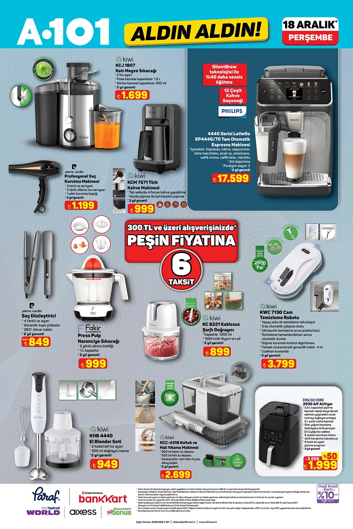 A101 Aldın Aldın aktüel ürünler broşürü bu hafta yine geniş ürün yelpazesiyle dikkat çekiyor. A101 afişi ile teknoloji, ev aletleri, mutfak ürünleri, müzik aletleri ve kişisel bakım kategorilerinde birçok ürün 18 Aralık 2025 Perşembe günü raflarda olacak.