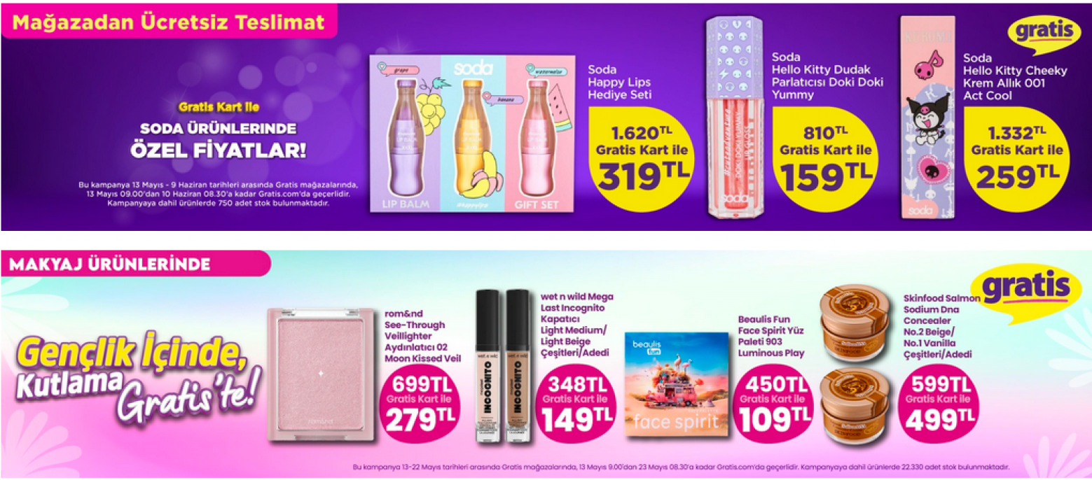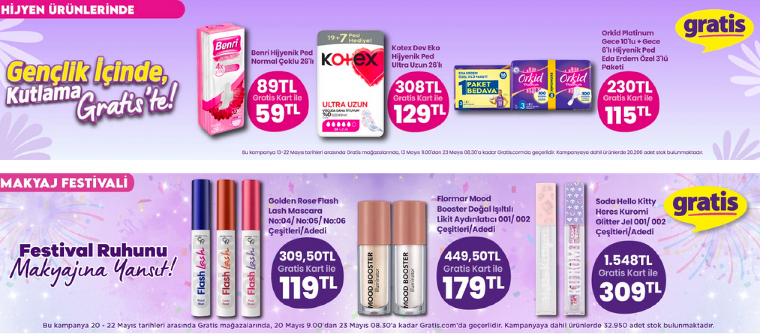 Ayrıca, gratis.com üzerinden yapılacak alışverişlerde 13 Mayıs saat 09:00’dan 23 Mayıs saat 08:30’a kadar geçerli olacak fırsatlar, güzellik severleri sevindirecek.