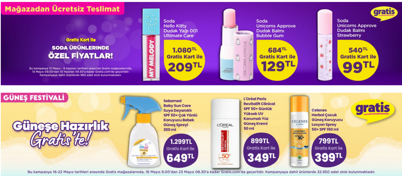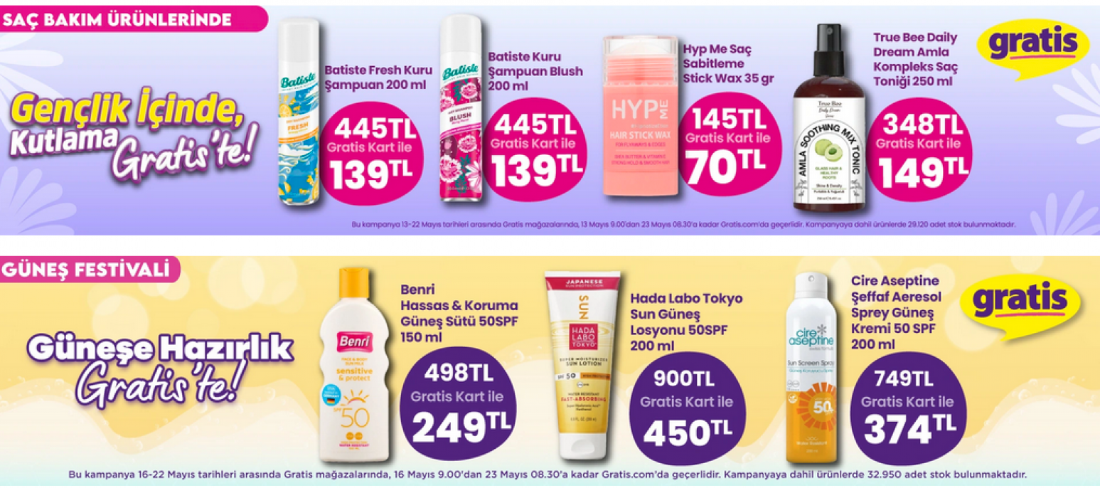 Türkiye’nin en popüler kozmetik ve kişisel bakım zincirlerinden Gratis, Mayıs ayında müşterilerine büyük bir fırsat sunuyor. 13-22 Mayıs tarihleri arasında düzenlenen kampanya ile, mağazalarda ve online alışverişte güzellik ürünlerinden güneş koruyuculara kadar birçok popüler üründe dev indirimler uygulanacak.
